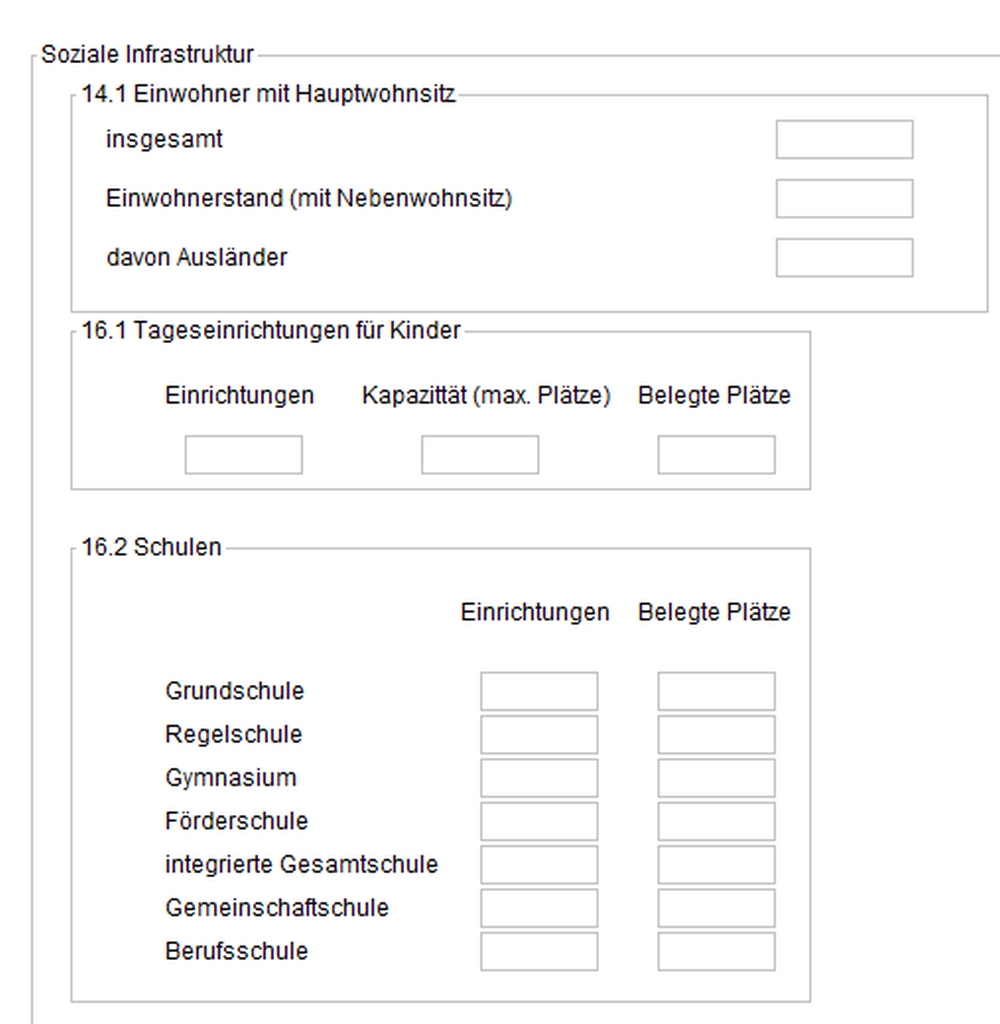 - Frei definierbare Gebietseinheiten, wie Baublöcke, Sanierungsgebiete, Stadtteile, Schulbezirke, Wahlbezirke etc.
